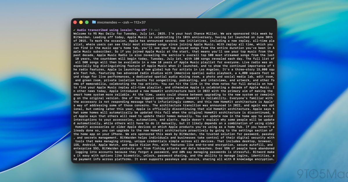 Pour mes propres tests, j’ai choisi un épisode récent de 9to5Mac Daily d’une durée de 7:31. J’ai utilisé MacWhisper pour exécuter Whisper et Parakeet, tandis que pour l’API de transcription d’Apple, j’ai utilisé le projet Yap de Finn Vorhees. Tous les tests ont été réalisés sur un MacBook Pro M2 Pro avec 16 Go de RAM.
